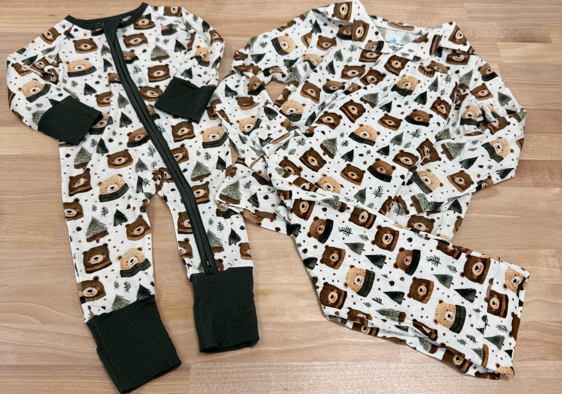 The Beary Christmas Set is the perfect addition to your little one's wardrobe this holiday season. Made from soft bamboo material, this sleep set features a button up top with a collar. The cream base with dark green accents and a charming print of festive trees and sweet bears in scarves make it ideal for Christmas and beyond. Stay cozy and stylish all winter long!