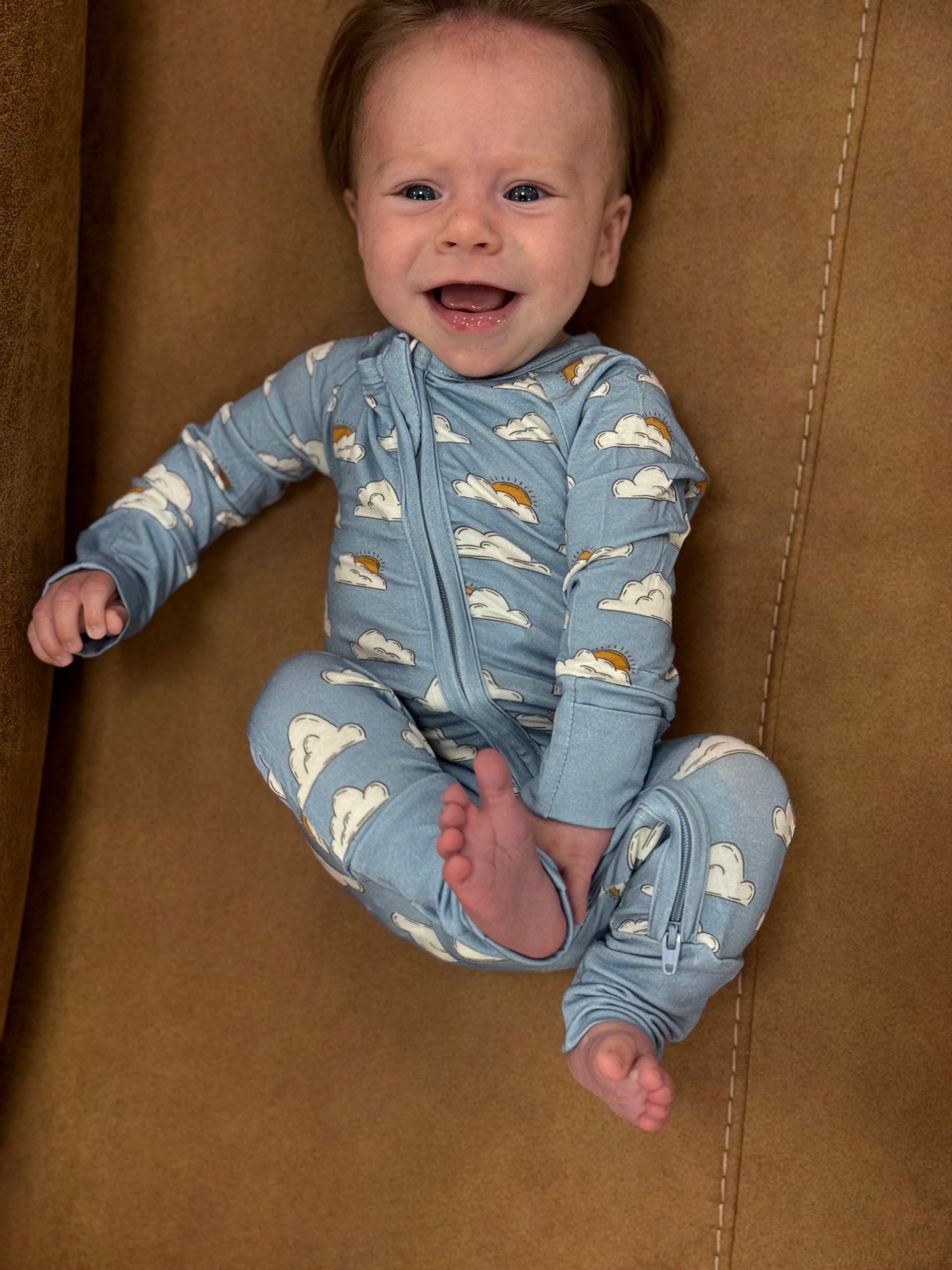 The Blue Sky Sleeper is a gender neutral bamboo sleeper that features fold over hands and feet, as well as a double zipper for easy access and convenience. Its light blue color and sweet cloudy sky design make it a charming addition to any baby's wardrobe. This sleeper is sure to provide comfort and style for your little one.