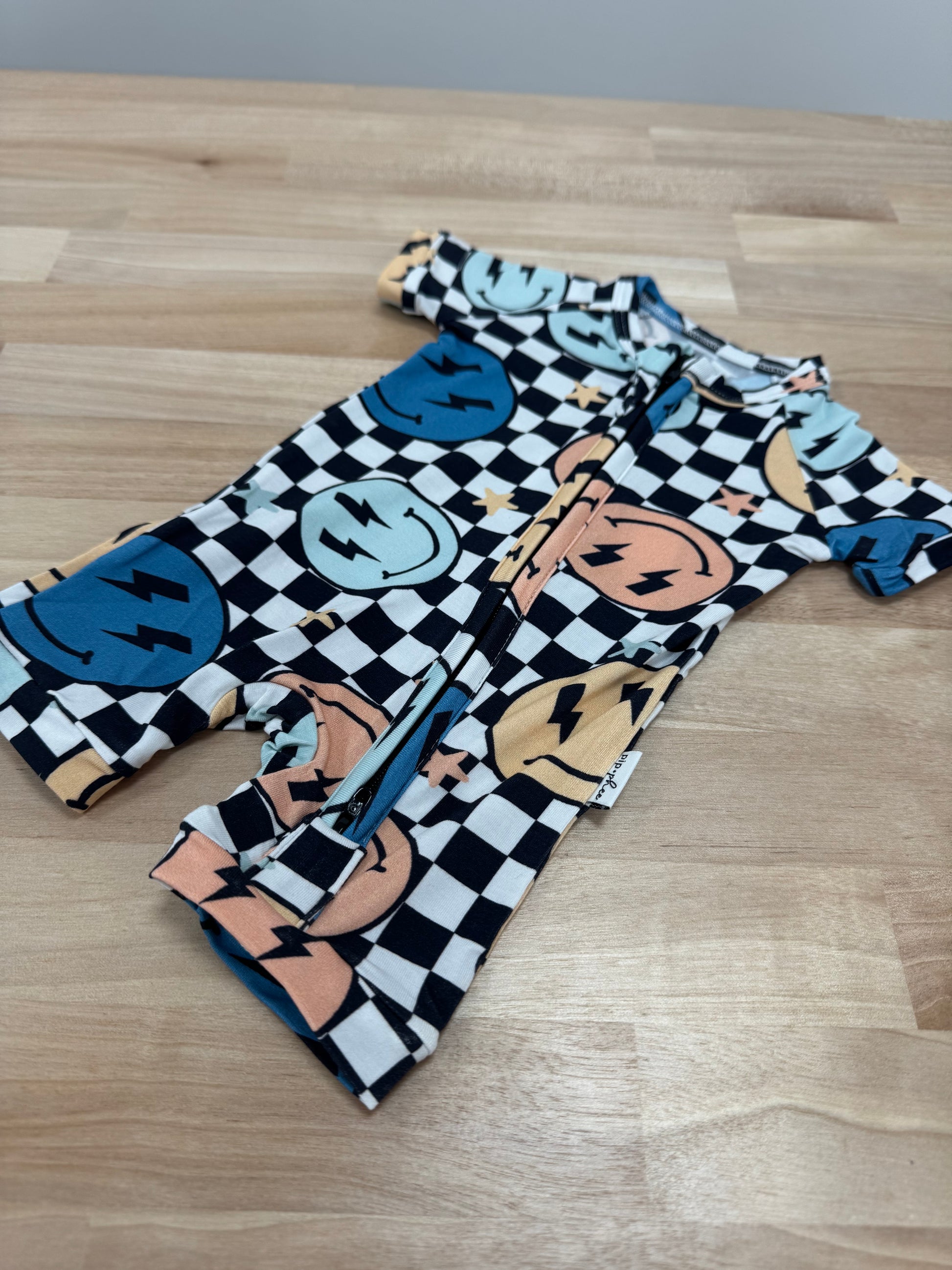 Introducing our Cool Smiley Shortie - a must-have for every trendy little guy. Made from bamboo with a checkered print, this shortie is not only stylish but also comfortable. The colored smiley accents add a fun touch, making your little one stand out. Grab one today!