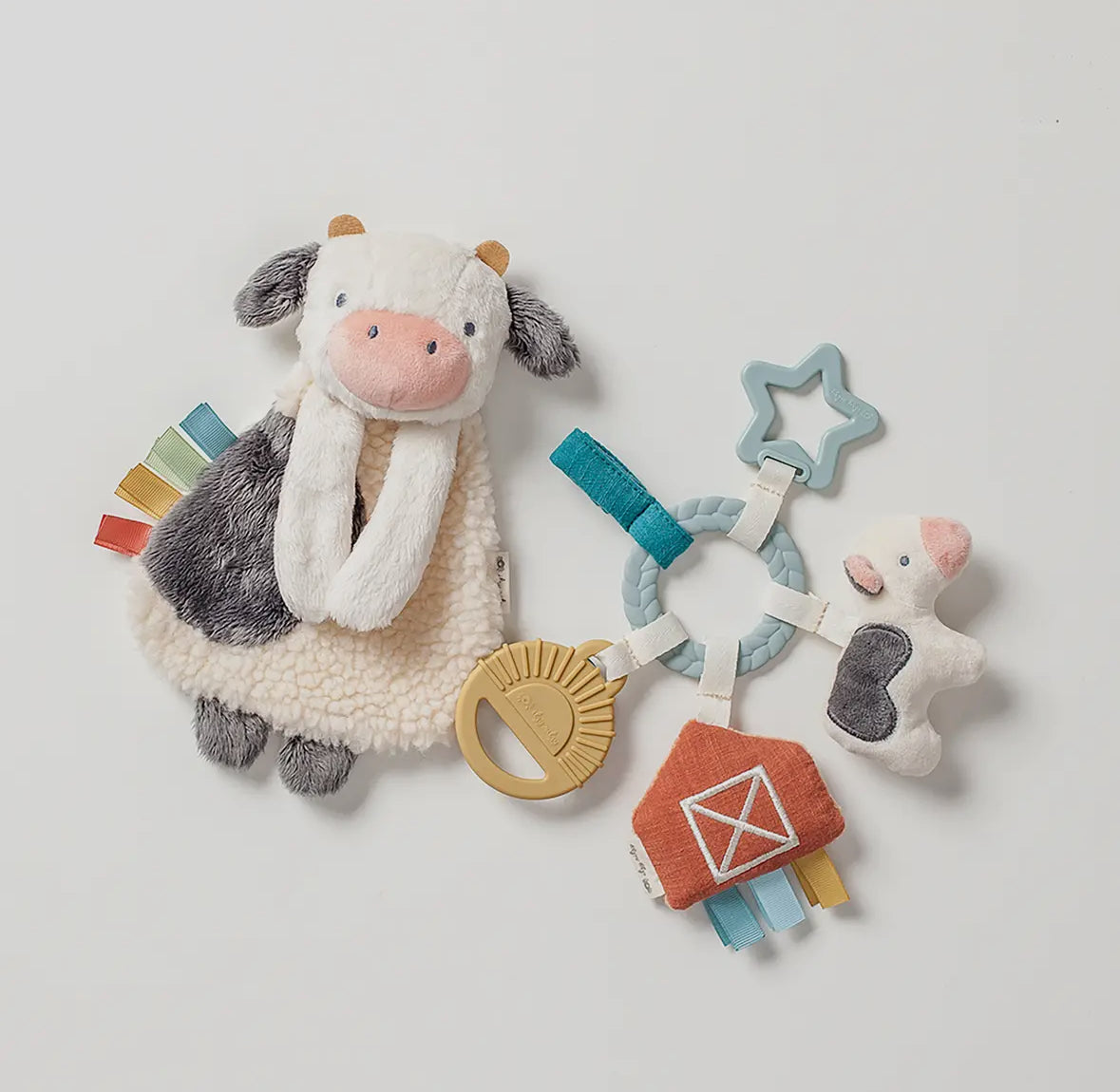 This FARM Bitzy Busy Gift Set includes a plush lovey and teething toy, both designed with a farm theme featuring cows and a little red barn. These soft and engaging toys will provide comfort and entertainment for your little one, making it the perfect gift for any busy parent or caregiver. Let their imagination run wild with this adorable farm-inspired set.