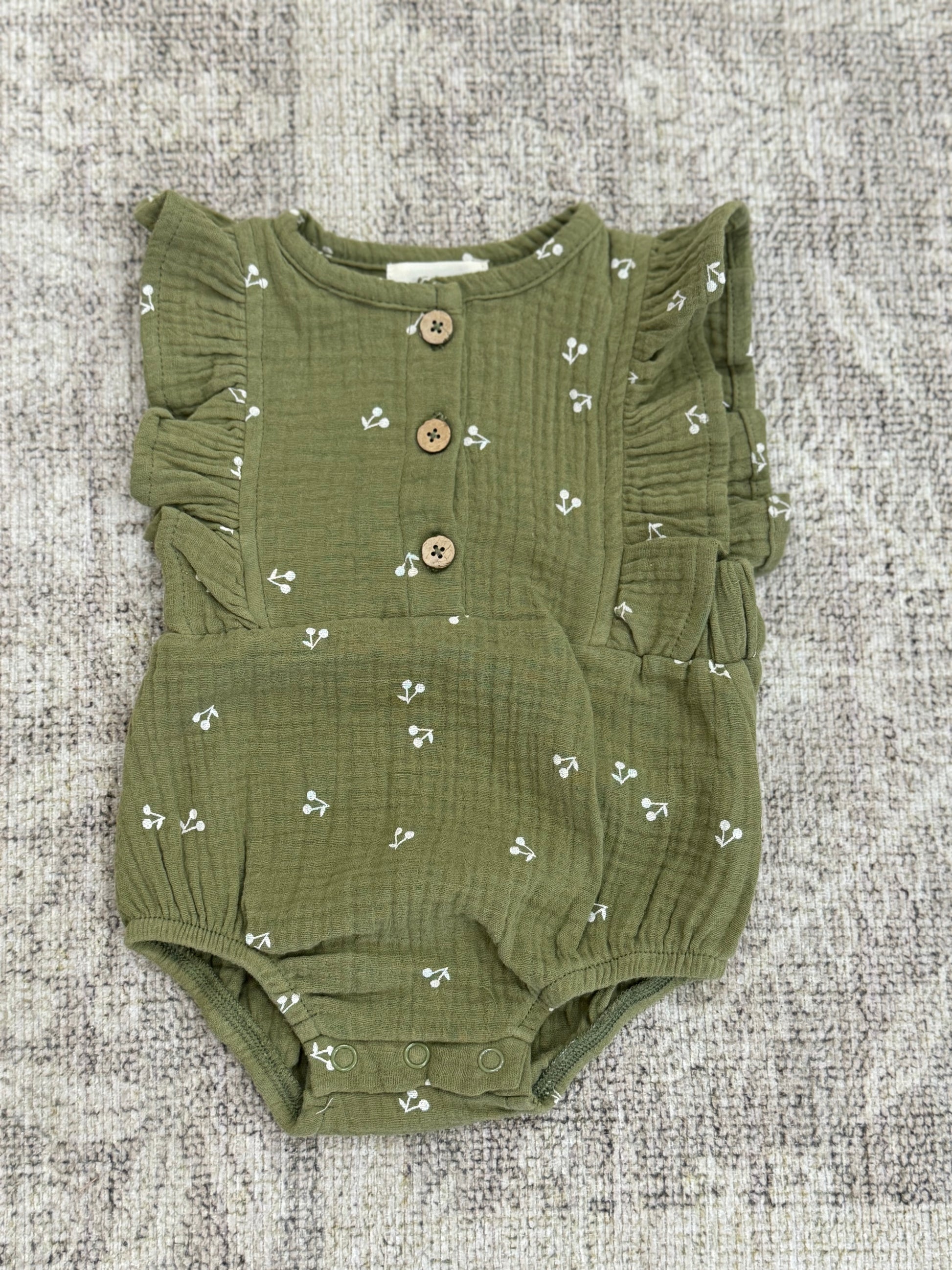 Introducing our Olive Ruffle Romper - a muslin romper in a rich olive color with a dainty cream cherry design. Made from high-quality material, this romper is not only stylish but also comfortable. Perfect for your little one's everyday wear.