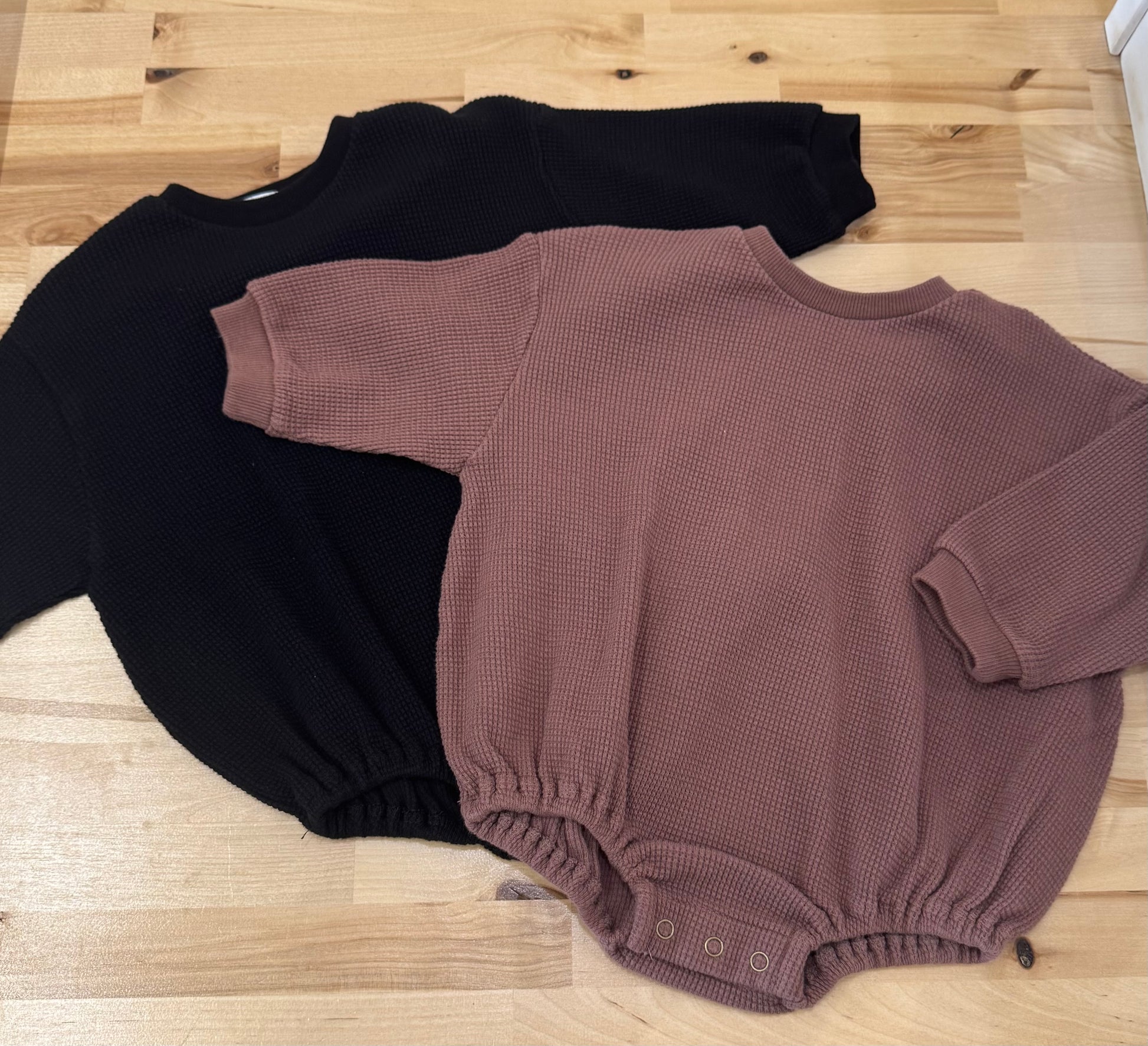 Effortlessly stylish, this Waffle Romper is a must-have! Made with cozy waffle knit and available in black and taupe, it offers an oversize fit for maximum comfort. Perfect for any occasion and gender-neutral, it will quickly become your go-to outfit choice for your little one.